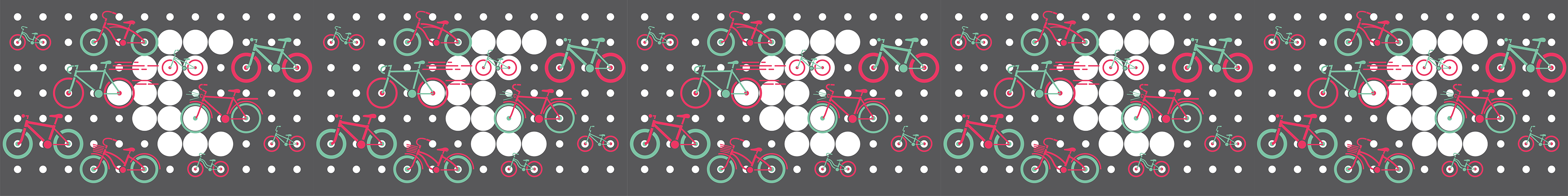 A proposal for a design for a new set of protected bike lanes in New Orleans. This design for a bike lane features a variety of bicycles to represent the different kinds of people and cyclists in New Orleans. This design aims to suggest a variety of uses of bike lanes and to enable a diverse set of riders to see themselves both in the design and as a biker in New Orleans streets. The design is based around a grid of circles. Each bike takes up two or three circles. Because of this modularity, it’s possible to continue varying the pattern while applying it. The design uses enlarged dots in the grid to create arrows, suggesting movement and excitement, and it subtly indiicating which way riders should be traveling. Completed with Alison Rex.